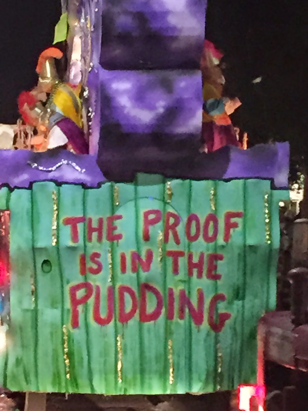 This one is poking fun at Bill Cosby, and it was not the only one. Here's the back of another Cosby float from the following night's d'Etat parade: