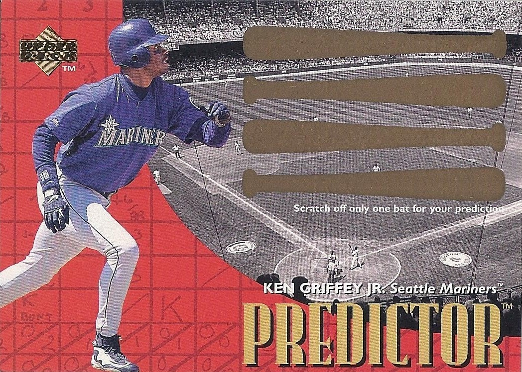 It wouldn’t be mid-90’s Upper Deck without Predictor. This year each card has four possible career goals, any of which each player could potentially reach. You had to scratch a bat to decide which goal met would make your card a winner. Design-wise it’s not much to look at which was disappointing considering Junior’s Predictor cards from ’95 and ’96 were such fine specimens of Griffeydom.