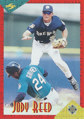 This is the first Griffey cameo I ever saw, and it was almost 20 years between when I discovered this card and when I finally owned one. Now, if you told me there was a second-baseman with two Griffey cameos in his cardboard history, I would expect it to be either Joey Cora or someone else in the AL West; but Mr. Reed is a Brewer, and he's not Joey Cora, either. That combined with the fact that every aspect of their uniforms is identical leads me to believe this is the same double play from the '94 Score Rookie & Traded card. If not, it's a hell of a coincidence.