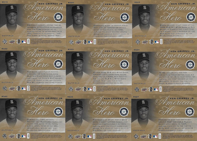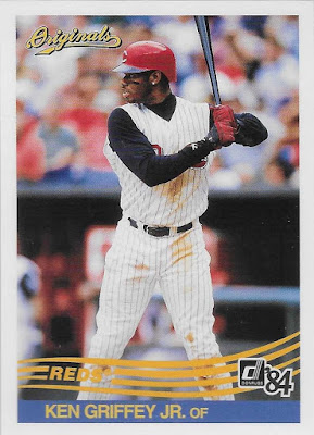 These fell one per rack pack, and they probably look familiar. The design is very similar to the Jumbo Pack Glossy Rookies from 1990. The back has very little actual information on it apart from the player name, but they look great and are printed in white paper with high-gloss fronts similar to the Tiffany cards. A very early bunt AND bat barrel shot of the Kid.