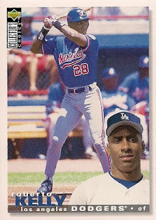 Night Owl - it is arguably the most bizarre card from 1995 Collector's Choice. It depicts a last-minute inset of R. Kelly in a Dodgers cap. Can't blame them for wanting to keep current with the whole "single series" idea of this set, but this is the only card that contains such an inset.