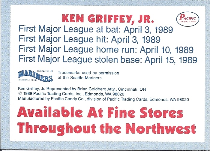 What I really like about these cards is that Griffey's attorney (and/or agent?) is named on the back. That's not something you see much on any baseball card.