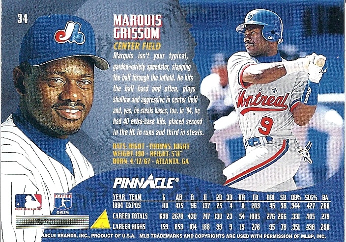 Marquis may not be angry here. I say that because this is what every picture of Marquis Grissom looks like. The furrowed brow, the slight scowl. He's just a very serious man. At the risk of throwing this post completely off-track, I gathered all my Marquis Grissom cards to find one smile:
