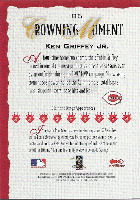 It's owners were very proud of the storied (and polarizing) Diamond King brand, so in addition to all the regular set variants and solitary insert, there are a buttload of promotional variants. Here's all the Griffeys from 2002 Diamond Kings I still need: