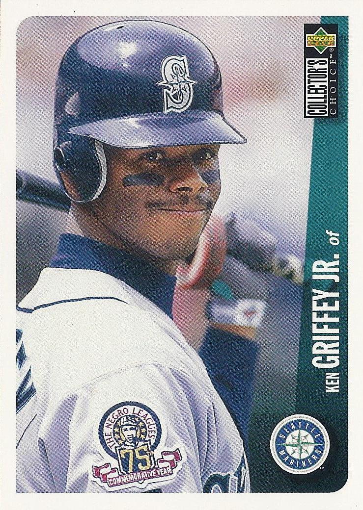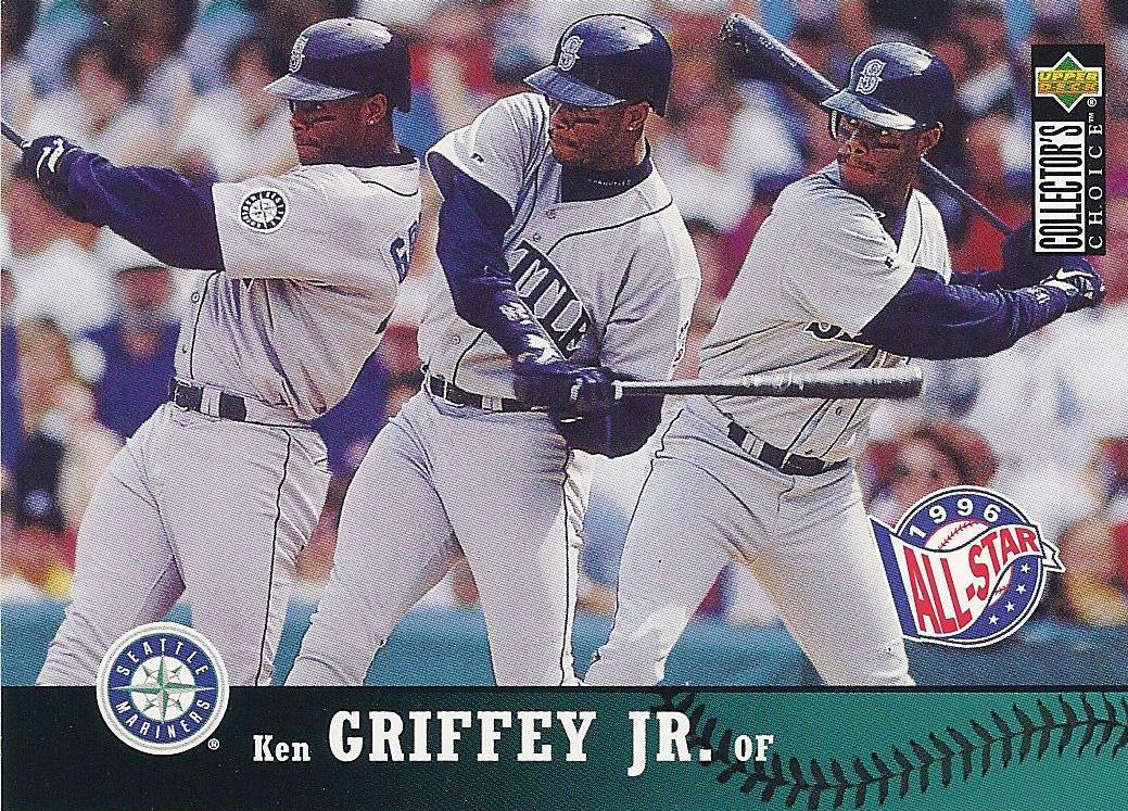 Keeping it simple with a color field along the long side and a team logo. This worked well because (with the exception of the team logo) they didn't have to change the orientation of the design elements for horizontal cards. Junior didn't get the borderless treatment in '96 despite making the All-Star team (and not starting), but Collector's Choice more than made up for it with this great portrait of Griffey sporting his 75th Anniversary of the Negro Leagues patch. On top of that they also had a great 10-card insert of Griffey die-cut cards.