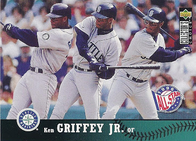 This year they made borderless cards for all kinds of dudes including rookies and even some non-All-Stars like Brian Jordan and Jay Buhner. I'm not sure the criteria for having your border removed - I think they just had to like you. Griffey got a cool card again, a kind of digital mock-up of a triple exposure card.