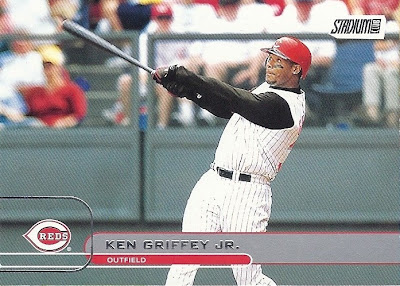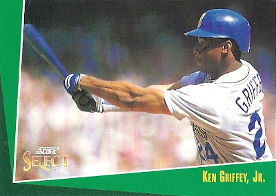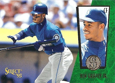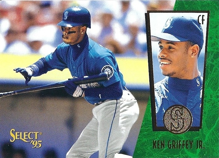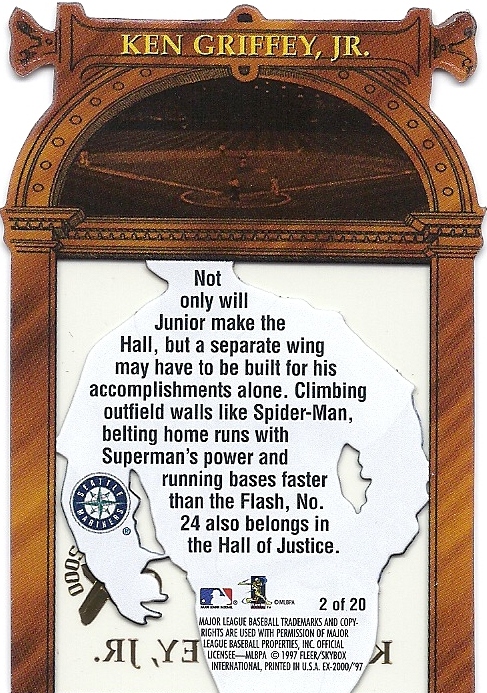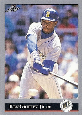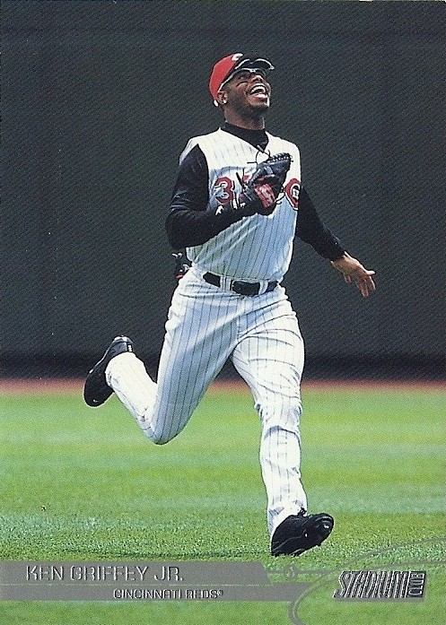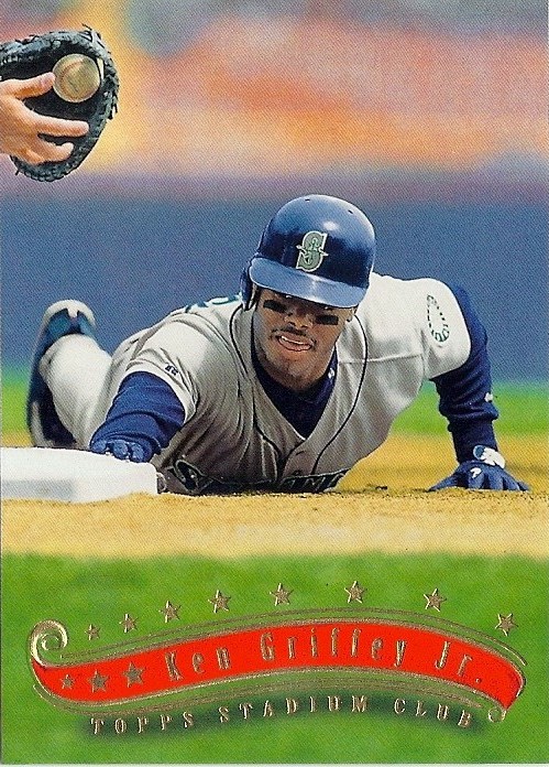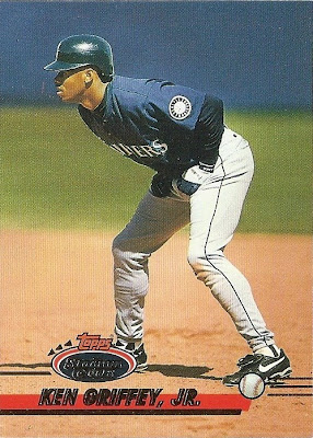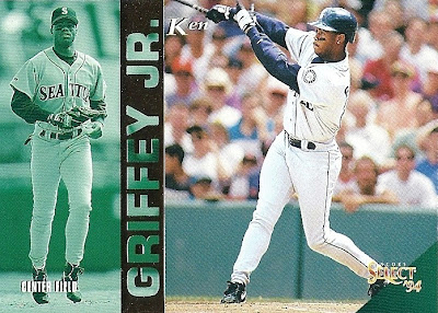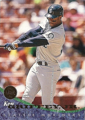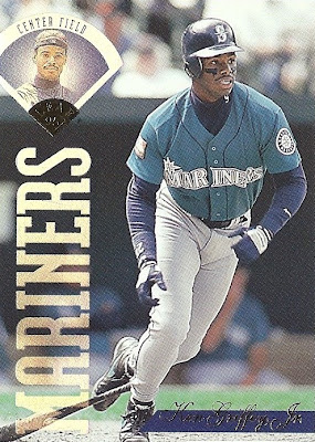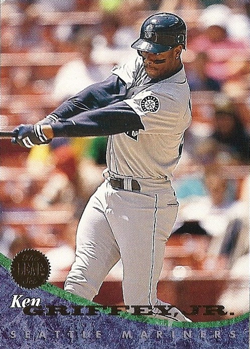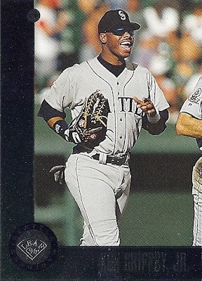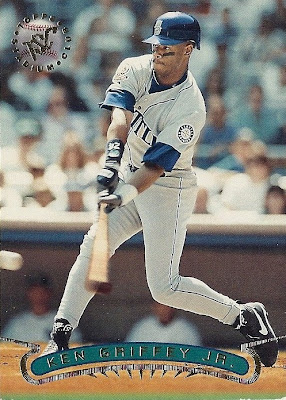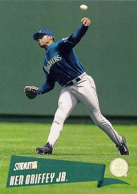 Only Ultra has more shots of Griffey fielding - it makes for some great pictures. This is the only time they would ever take up the entire bottom border of a card, and I think they did it well. Everything's centered, I love the date on the front, the name bar looks sweet in holofoil, and I'm a big fan of incorporating baseballs into the design. Not as minimalist as some other years, but a fun design.