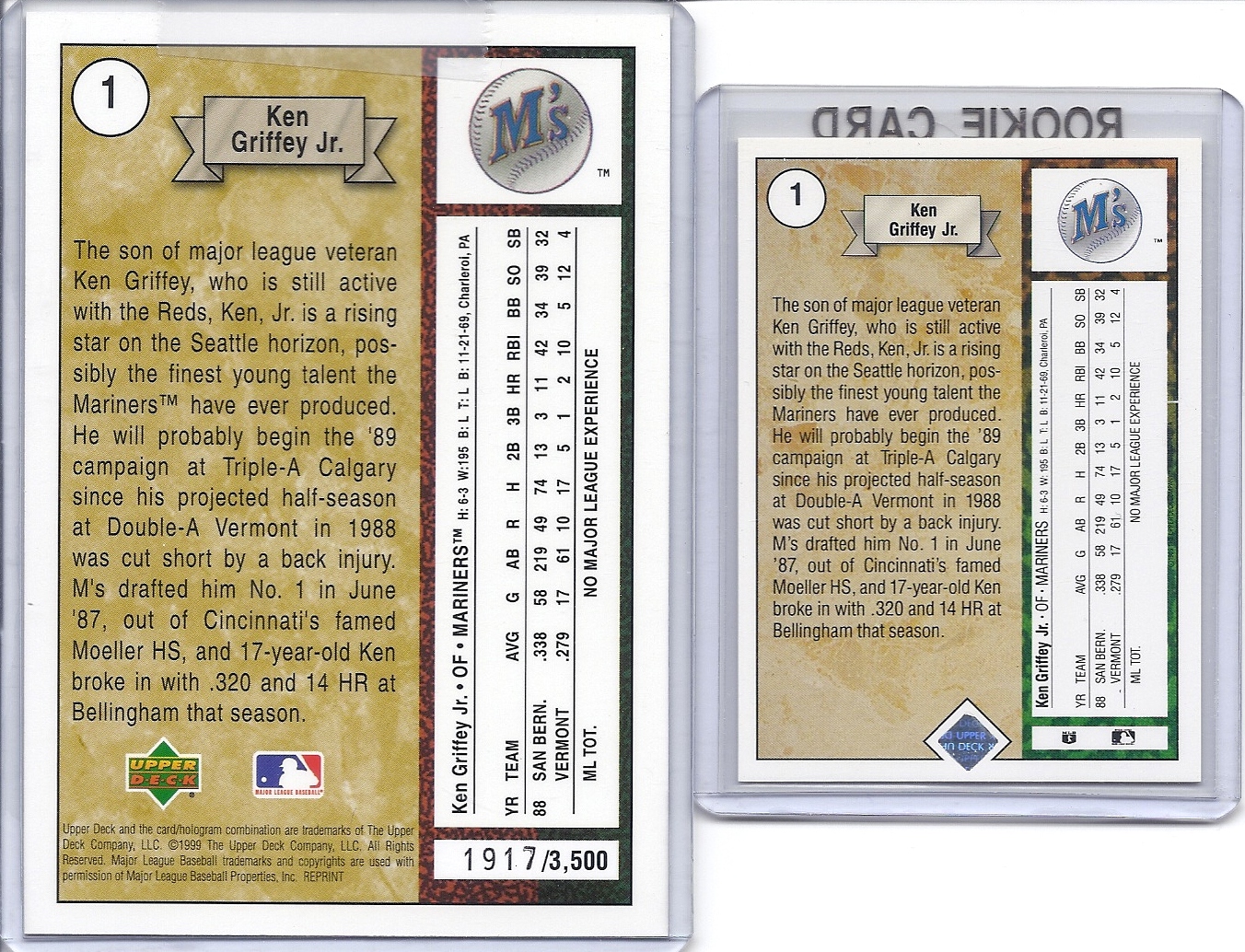 UD put out three oversized versions of the '89 Upper Deck rookie for the ten-year anniversary. There are gold, silver, and blue foil versions that are numbered as low as 500 and as high as 3500. They're pretty high-quality, too.