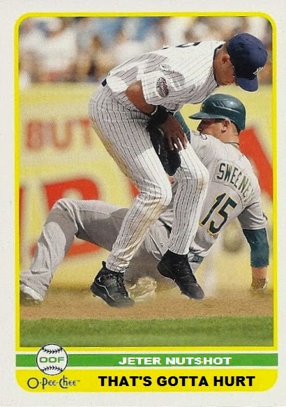 This is less a Ryan Sweeney card than it is a "We got a sweet shot of superstar Derek Jeter catching one in the marbles. LOLZ. Sorry, whoever that is in the background - you're getting the Jeter crotch photo...."