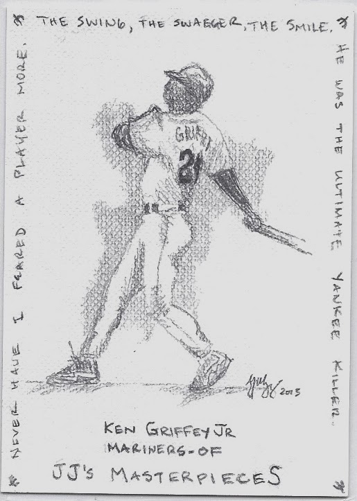 I appreciate this one in the same way as the above ring card in that it is a gift from a fellow blogger. The difference here is that this card was hand-drawn. It's from AJ of The Lost Collector, and it was his entry into my Ultimate Griffey Giveaway back in August. I call this card my first Griffey 1/1, and it remains so to this day. AJ can draw, am I right? Great detail here.