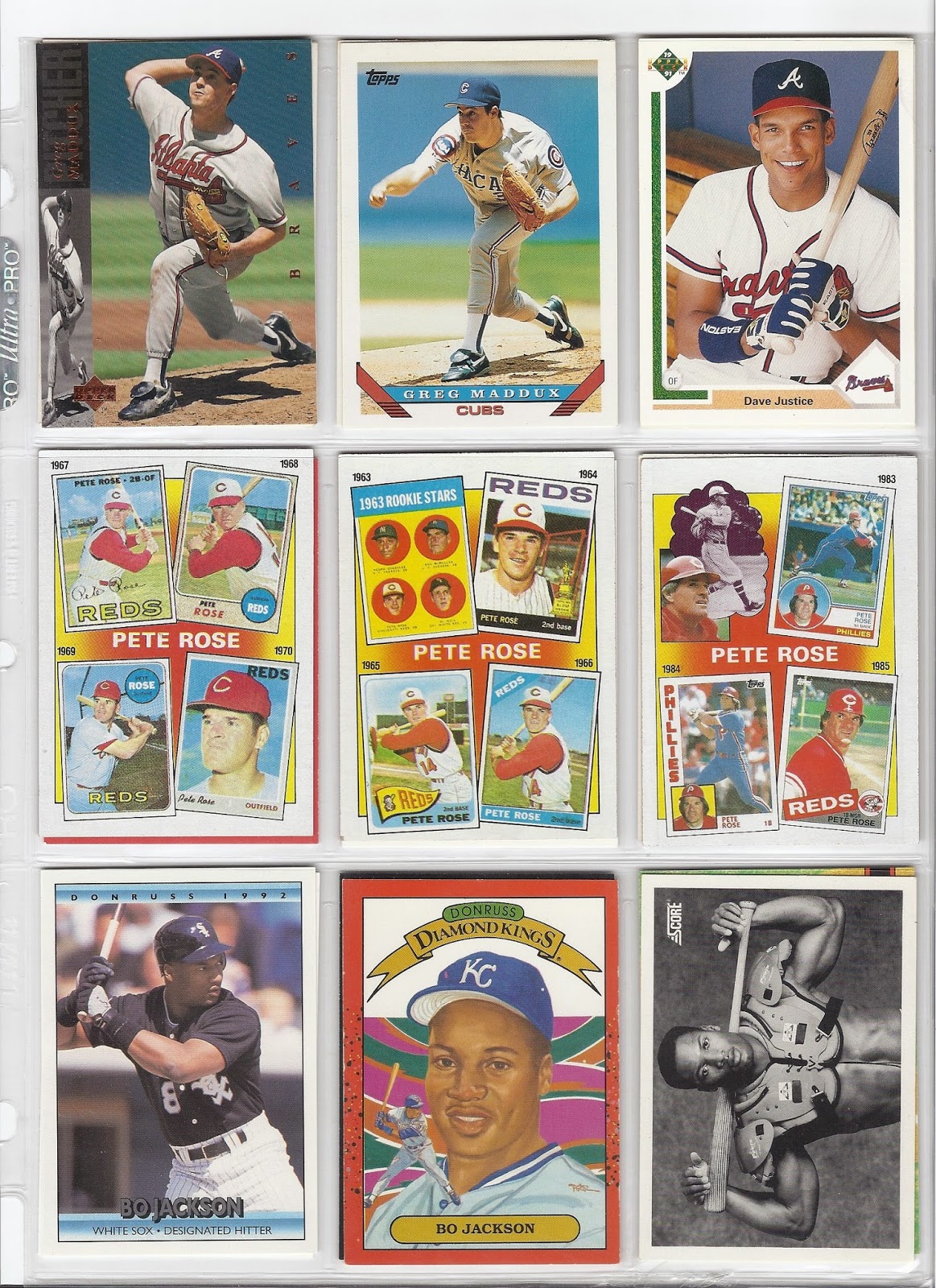 I have one of those Pete Rose Topps 4-card tributes, but here's the rest along with fresh-faced, untainted Dave Justice and one of the most popular Bo Jackson cards of all time.