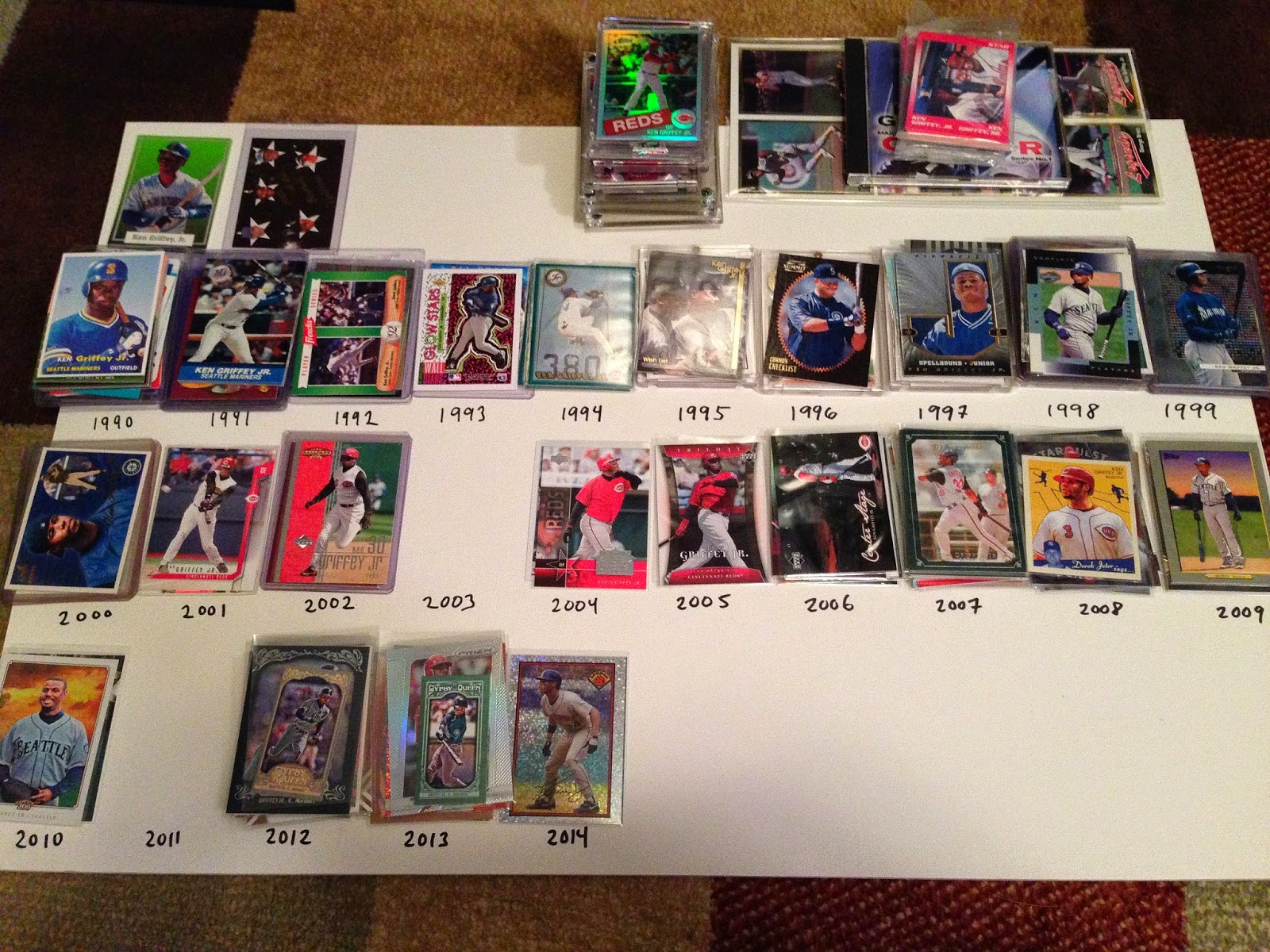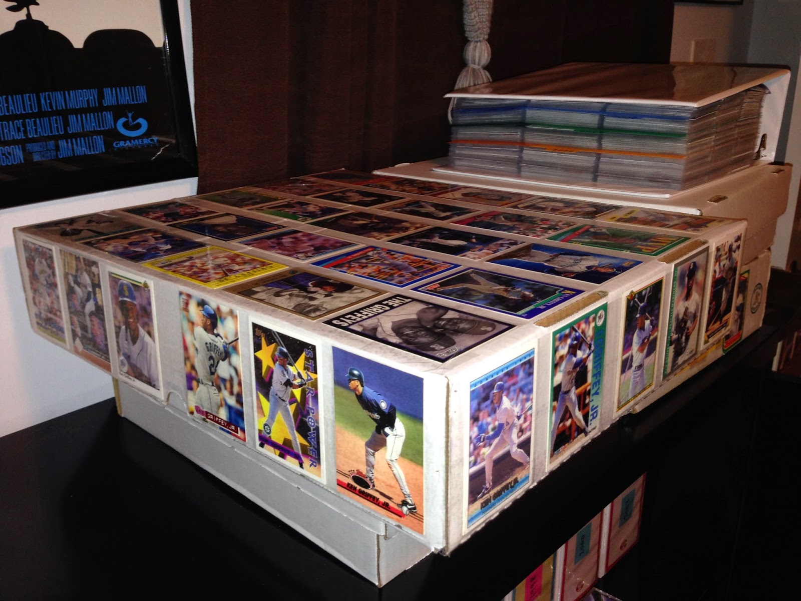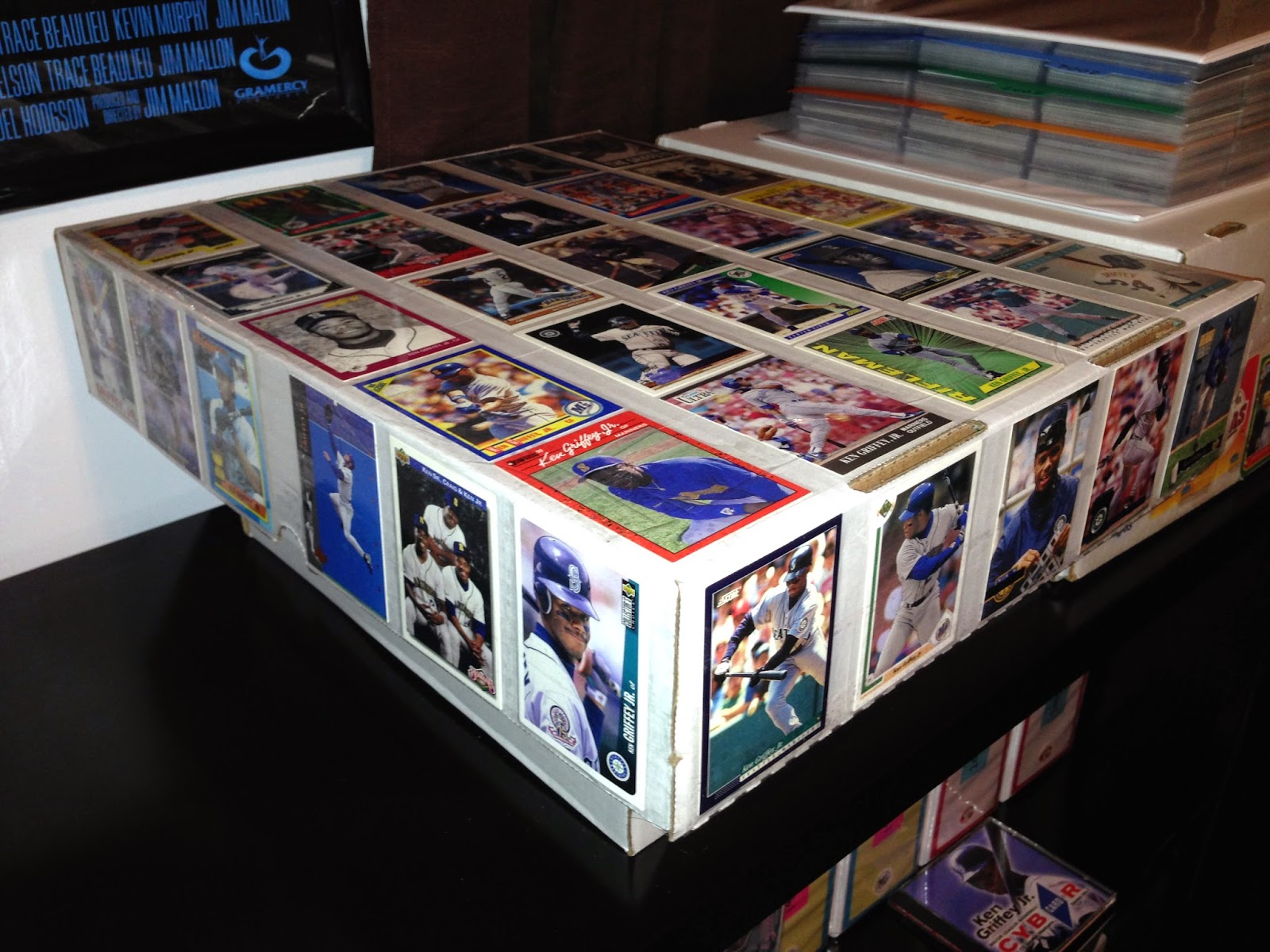 In the meantime I decided to decorate the overflow box (a giant 5,000-count number) with damaged specimens of which I have the largest quantities. A glue stick, a bit of clear packaging tape, and 47 slightly damaged Griffeys later….