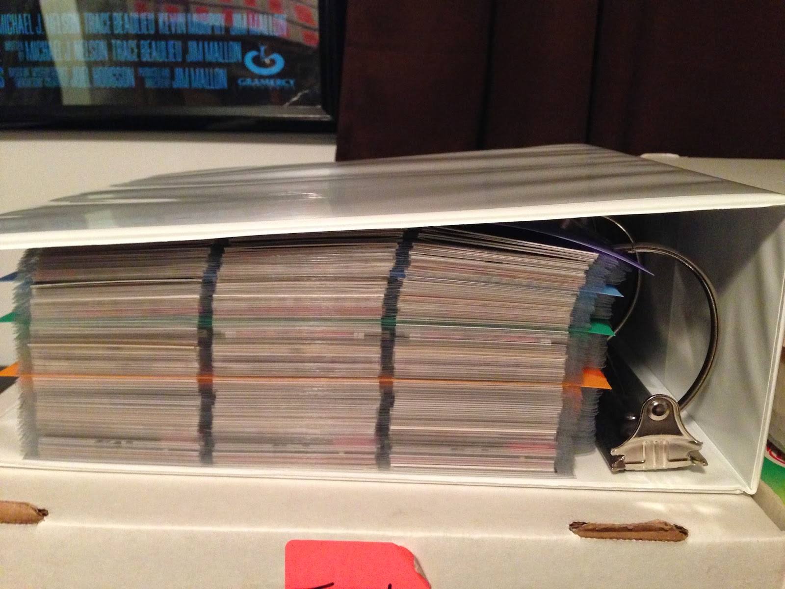 First, the binders are getting very full, and I’m running out of spare UltraPro Premium 9-pocket pages. I swore a few months back that I would never add another binder (I’m currently at nine 4” binders), so I’ve instead been shuffling cards around within the binders and moving large quantities of duplicates to an overflow box that gets heavier and heavier. About half the time I spend “sorting” I am actually harvesting UltraPro pages.