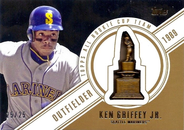 This is the Daddy of manu-relics, my friends. The original Topps All-Star Rookie Trophy (which predates me and both my siblings, by the way) cast in metal, mounted into the thickest card in Christendom, and numbered to only 25 of which I got the very last one. The Rookie Cup is a lot more recognizable to me than the trophy being that I'm a child of the 80’s, but this trophy has history. It’s on my Rusty Staub and Ron Swoboda rookies as well as countless other vintage gems. And again, that trophy is a proprietary Topps thing which makes this just as authentic as any jersey/bat/patch/jock strap relic you may come across. I stand by that.