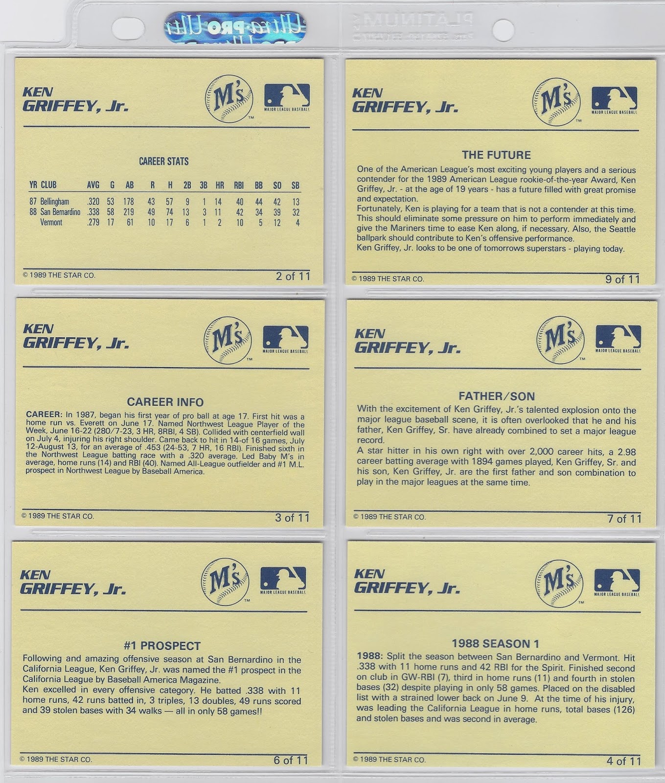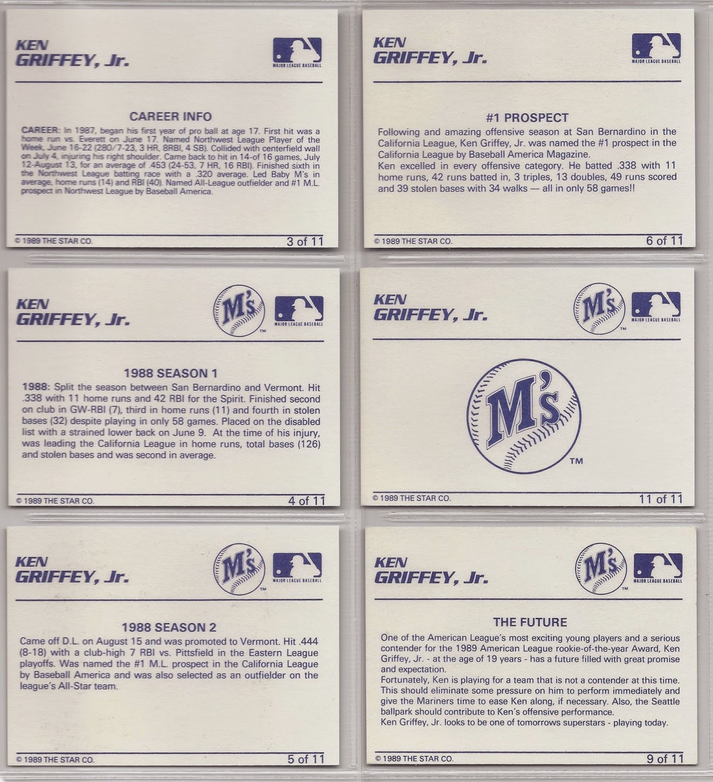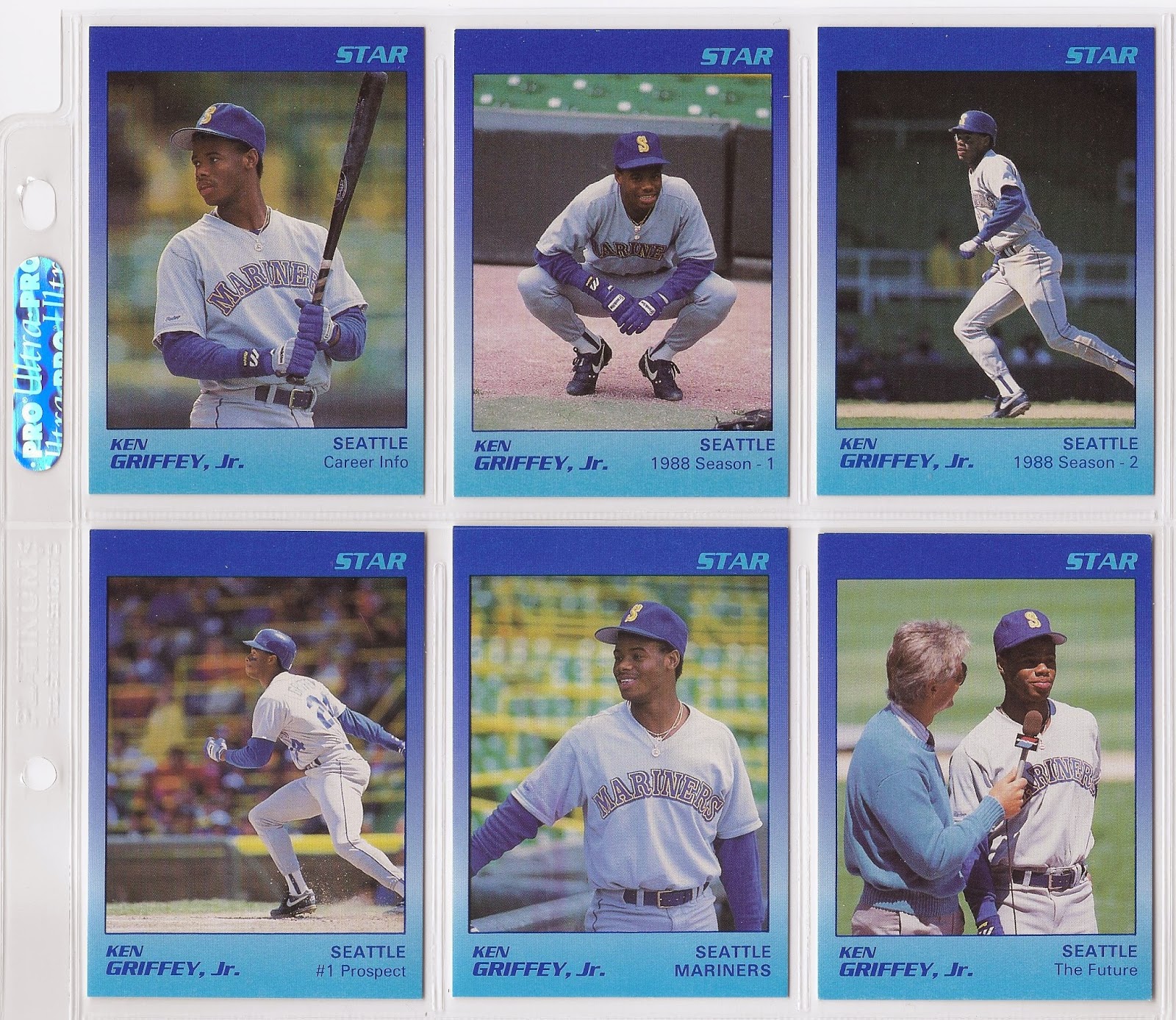 Collecting Star is not fun. On the contrary it is very much a chore. What I really want is for someone to knock on my door offering to sell me every Griffey Star card for one flat price so I don’t have to deal with the task of collecting them. Then I can stick them in a box somewhere and forget about them. And when I’m dead and rotting in my grave said box can be tossed into a landfill by my next of kin only to be unearthed years later by the scavengers of a post-apocalyptic futurescape after the failure of world systems theory comes to fruition. Then those scavengers can toss them on a communal fire to warm, if only for a moment, their doomed, cancer-ridden babies born into this radioactive wasteland only to spend a handful of years crying and choking in an Earth-shaped burning plastic pit of despair.