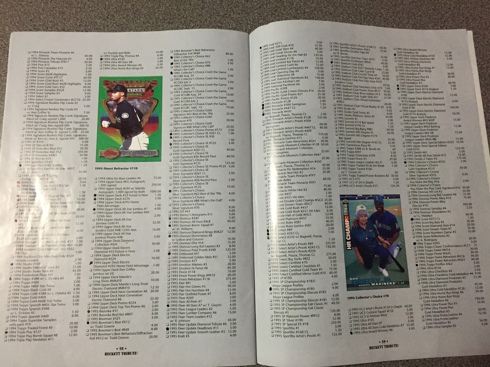 This is my copy of Beckett Tribute Issue 15: Ken Griffey, Jr. from 1996. It is at once my favorite and most despised periodical ever produced - favorite because it’s all about Griffey; despised because it made me realize that my dream of owning one of every Griffey card produced was probably never going to happen.