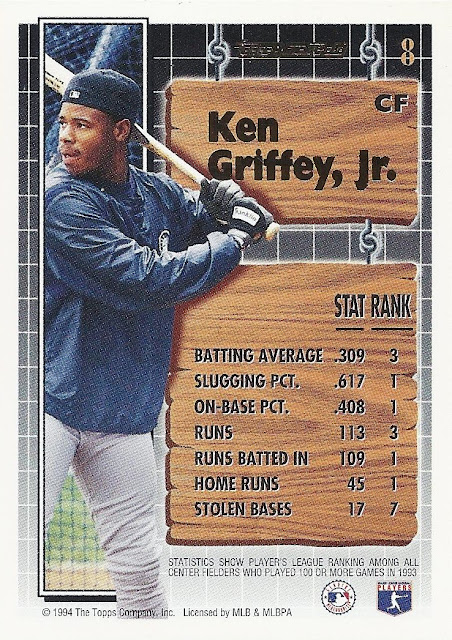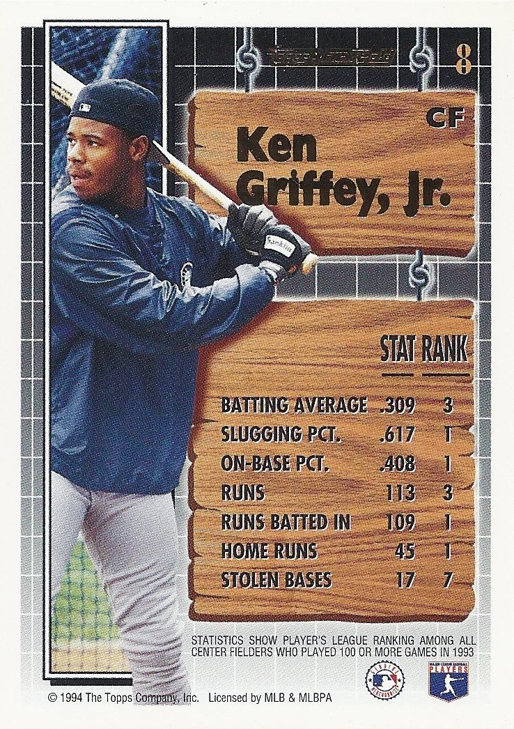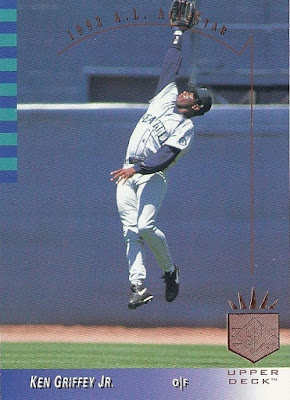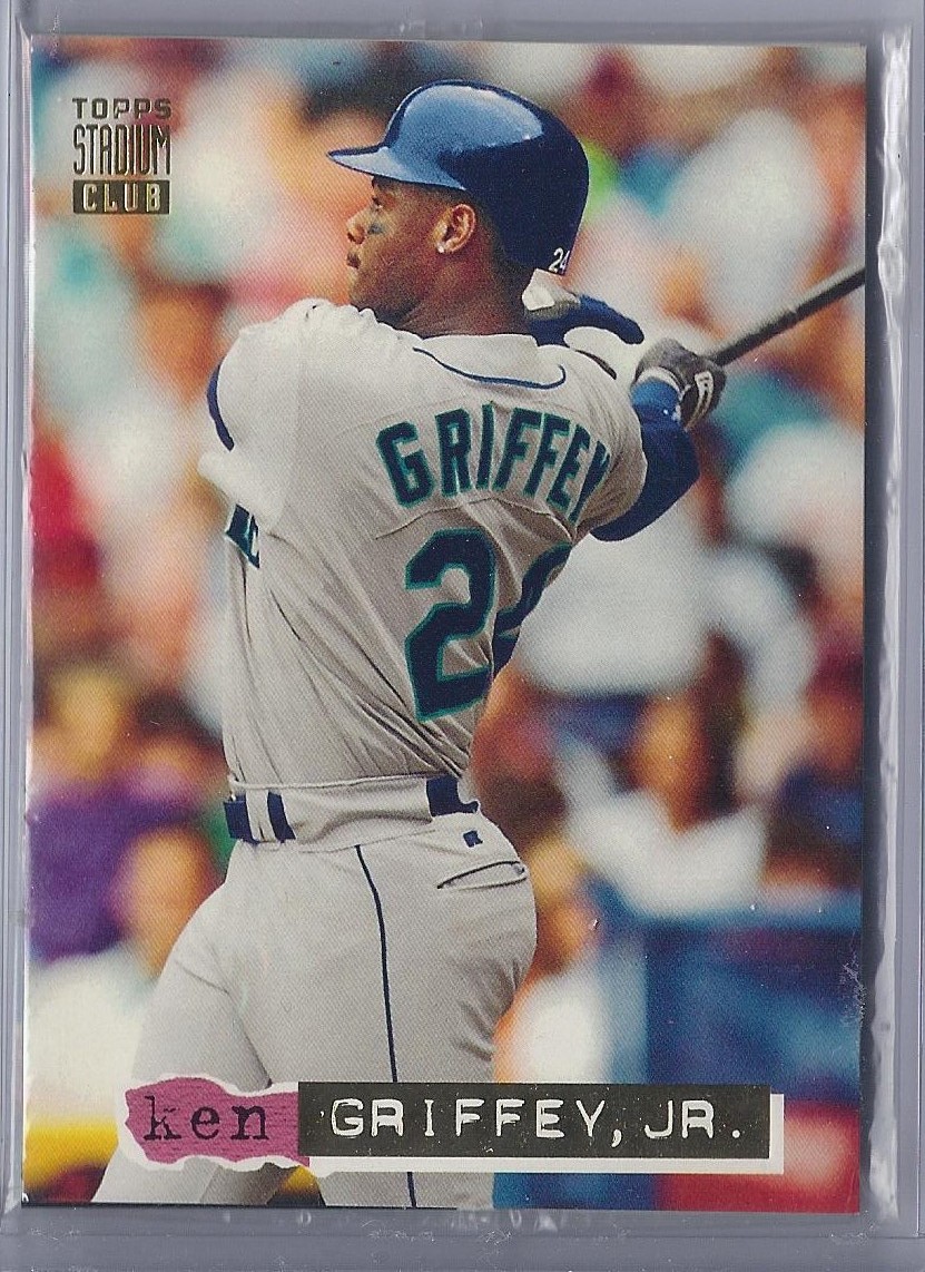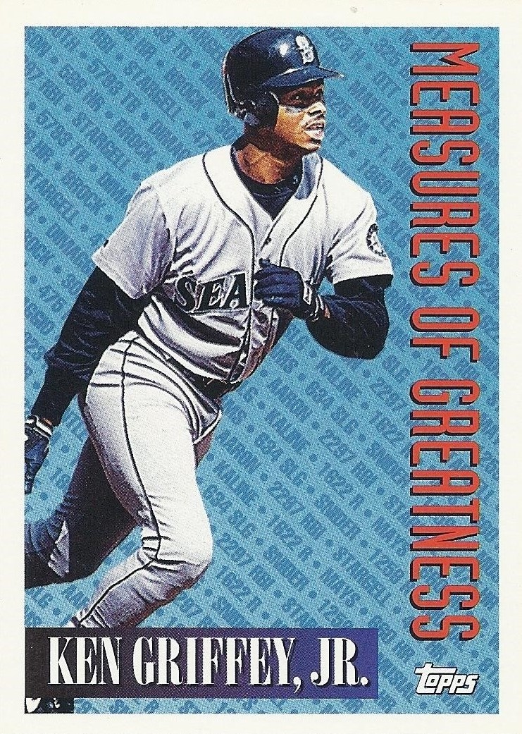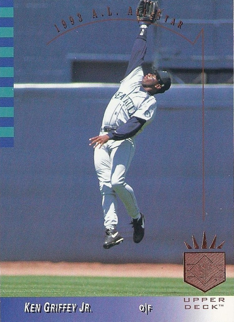 Oh, that’s nice, too. This 12-cornered beast is all about balance and centering with card-spanning elements on multiple axes each offset by identical elements on the opposite side. You’re looking at what is probably the most bilaterally symmetrical baseball card ever made. Throw a bunch of holofoil on that with some neat little raised-printing baseballs in the corners and you’ve got yourself a beast of a base card. The inserts in this set were heavily Griffey-centric, too, so you better believe I am biased. A very fun design.