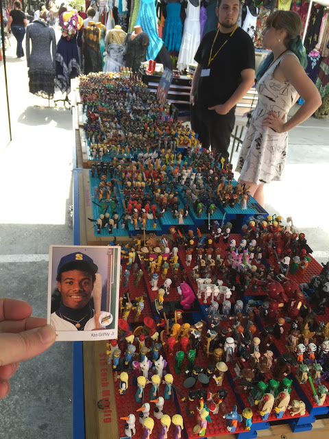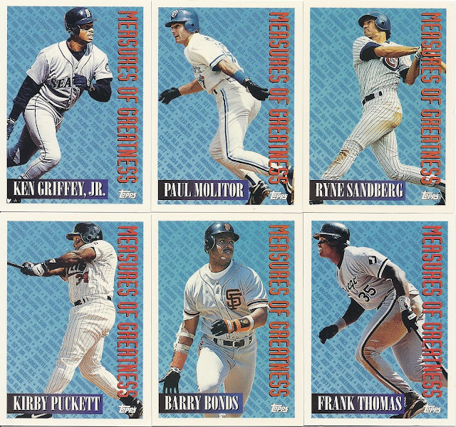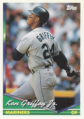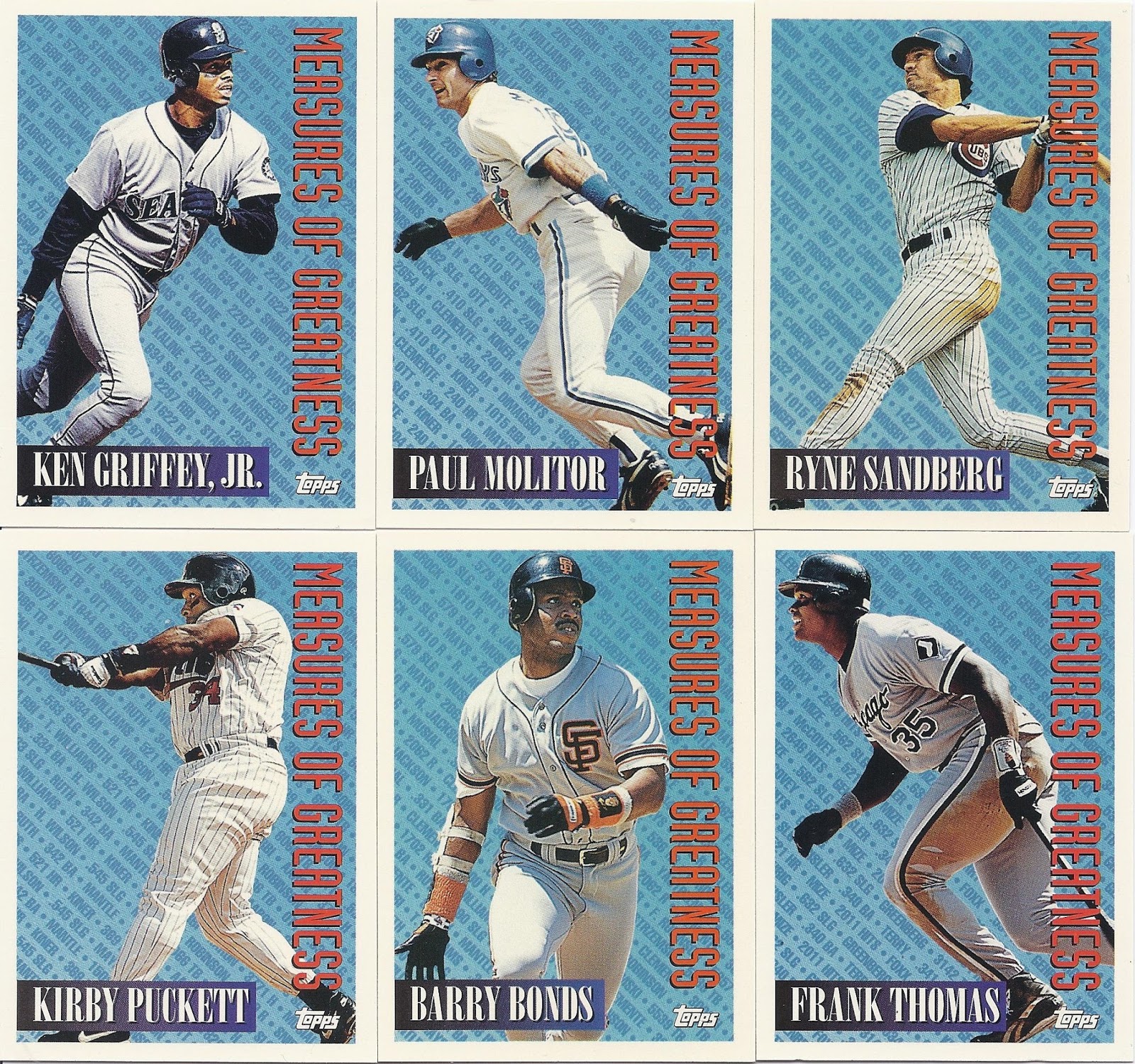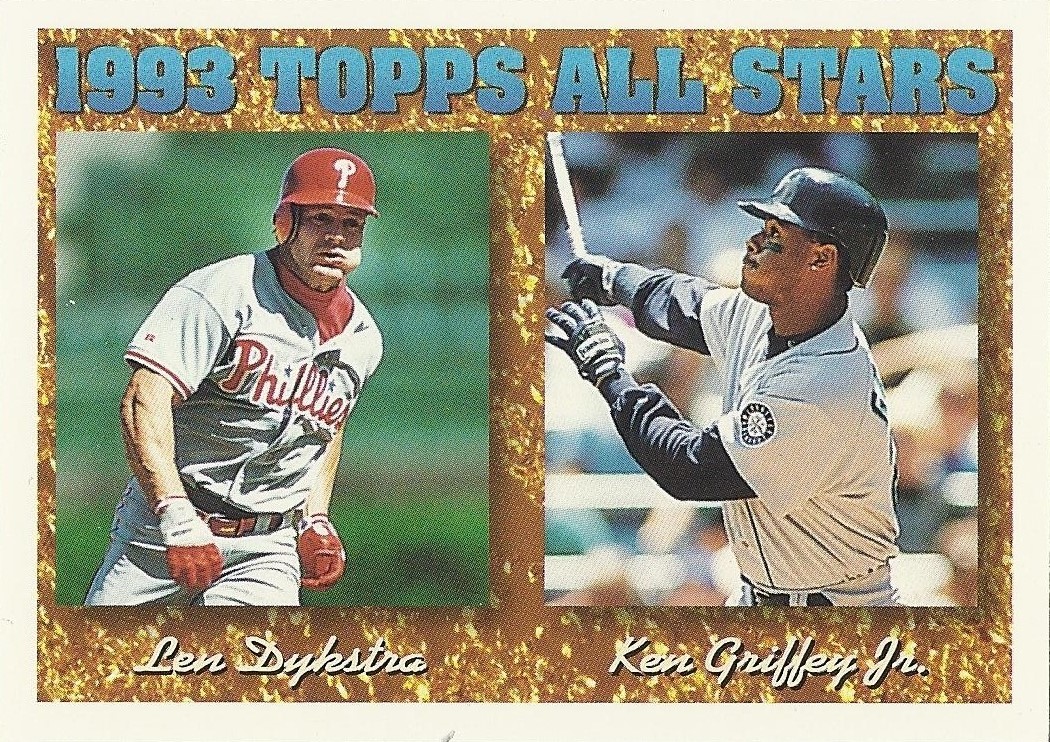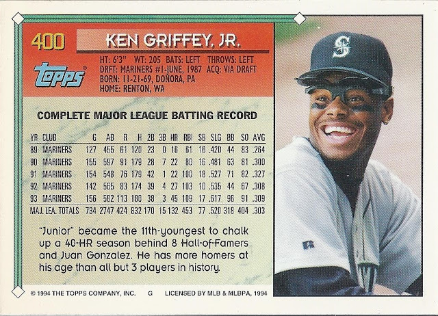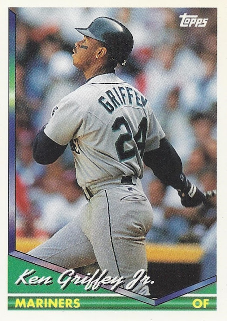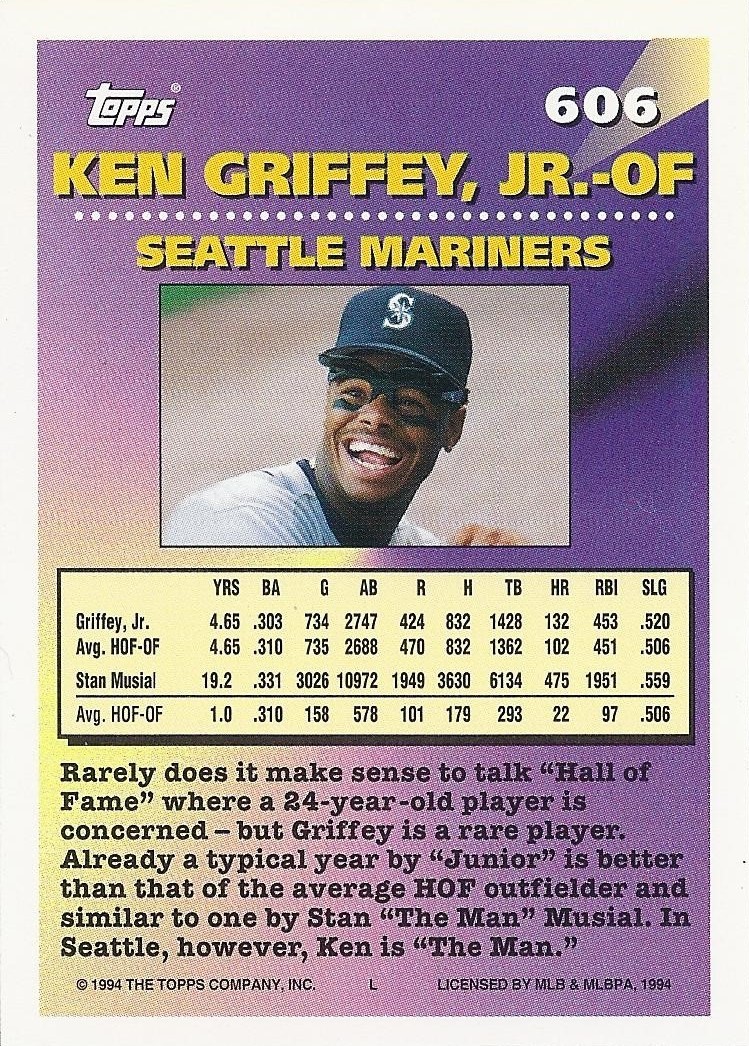 Oh, that’s nice, too. This 12-cornered beast is all about balance and centering with card-spanning elements on multiple axes each offset by identical elements on the opposite side. You’re looking at what is probably the most bilaterally symmetrical baseball card ever made. Throw a bunch of holofoil on that with some neat little raised-printing baseballs in the corners and you’ve got yourself a beast of a base card. The inserts in this set were heavily Griffey-centric, too, so you better believe I am biased. A very fun design.