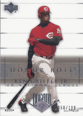 Kevin collects Griffey cards, so it means a lot that he would send me this silver parallel from 2002 Upper Deck Honor Roll. There are only 100 of this guy floating around, and the differences from the regular base card are very slight.