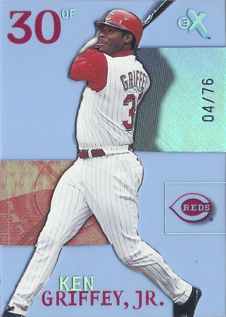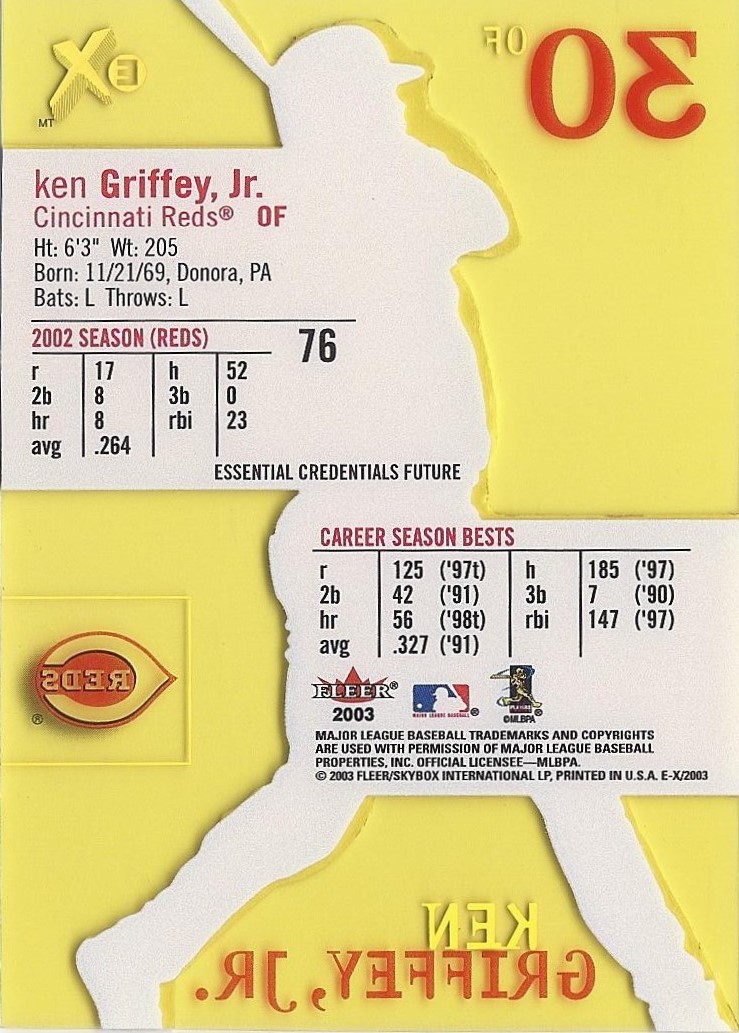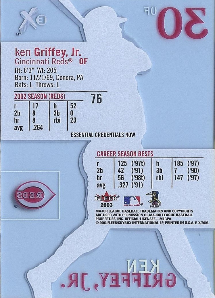 I'll go ahead and mention here that Griffey is in ZERO inserts in 2003 E-X. Goose egg. Nada. That brings the total number of cards needed to complete Griffey checklist to three: his short-printed base card and the two Essential Credentials parallels.