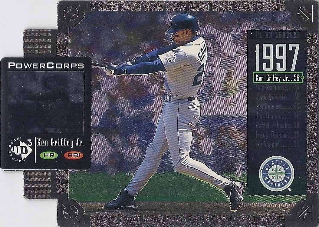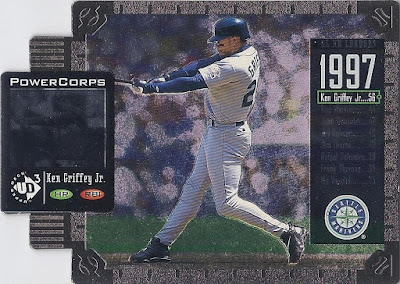 A very confusing, multi-faceted base set. There are several different Griffey cards available, but I'm never quite sure which version I'm looking at because they're all so similar. The card numbering is just as confusing and includes three different numbers: set, subset, and "technology" along with die-cut versions. The set number for this one is 60, and that's good enough to get it a spot on this page.