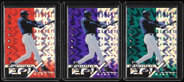 Ladies and gents, the commonest of the common Epix Griffeys. His Play cards were distributed via packs of vanilla 1998 Score with the insertion ratio of ALL 24 Epix cards falling at about 1:61 packs. That puts the purples at 1:488 and the Emeralds at 1:610.
