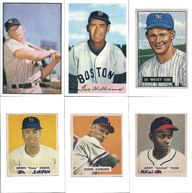 One cool tidbit about this set: The Bowman Company was having a contest that year, giving away a bunch of old Bowman cards from the 40's and 50's; and to advertise this they included a bunch of “reprints” of the old cards with sweepstakes entry forms on the backs. These never seemed like they were worth anything, but I kept them because they're awesome. Here’s all of them: